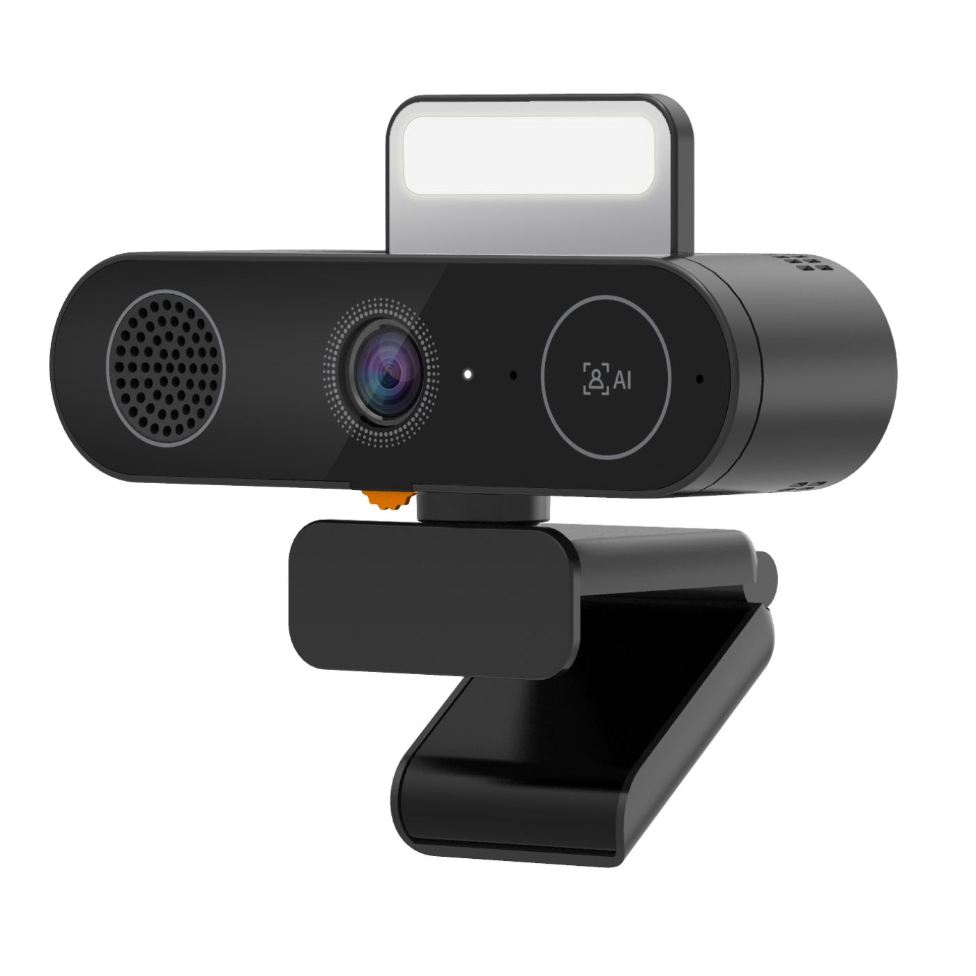 2K Mini video bar innehåller kamera, mikrofon, högtalare och en uppfällbar lampa som förbättra ljuset för kamerabilden