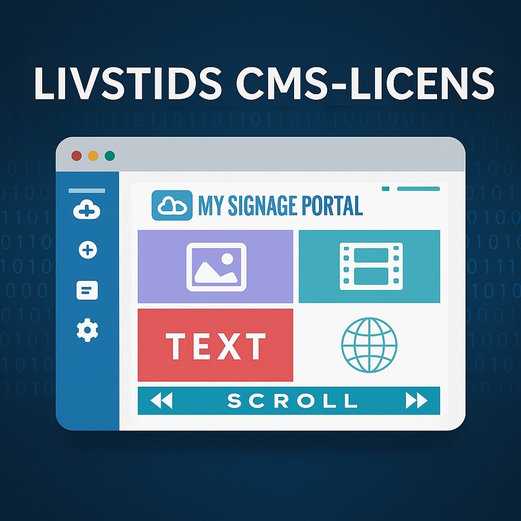 Allsee CMS livstids-licens är en molnbaserad lösning för samtliga Allsee’s androidskärmar. Licensen är giltig i ett år och kan sedan förlängas om så önskas. Kräver Allsee’s mjukvaruspelare är förinstallerad, eller Allsee’s externa mediaspelare