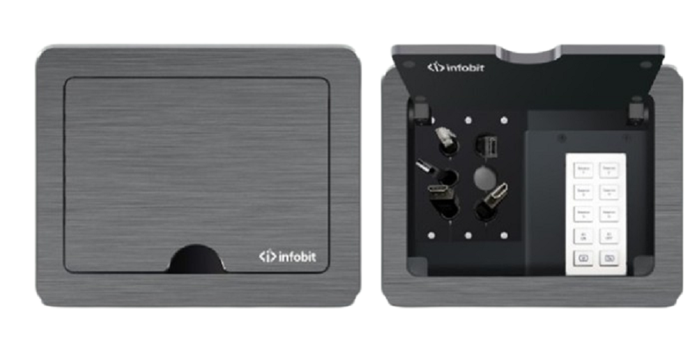 Den levereras i ett praktiskt bordshölje med sex utdragbara kabelgenomföringar, vilket gör den lämplig för installation på konferensbord.