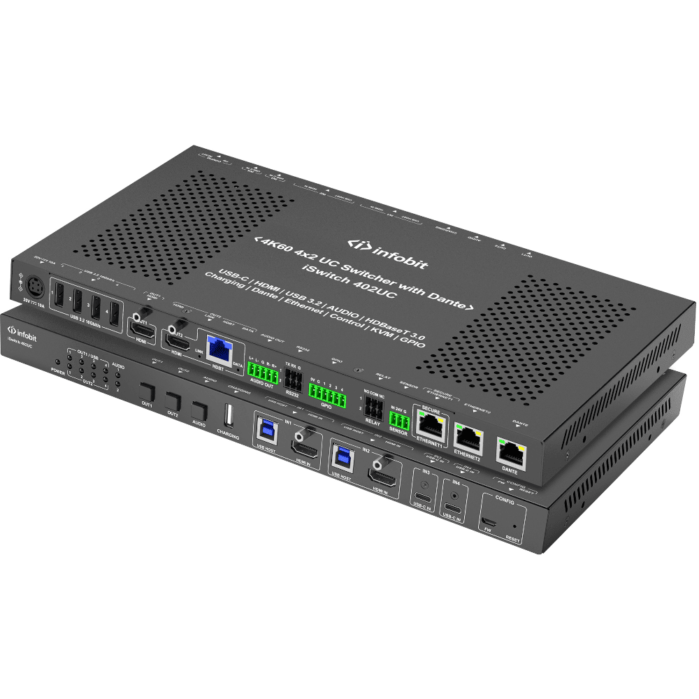 - 4×2 konferenspresentationsswitch, integrerar video, ljud, USB, kontroll och Ethernet.