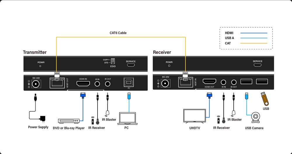 iTrans E150U2-R tar emot 4K HDR-video, ljud och USB 2.0 över HDBaseT 3.0 upp till 100 meter från sändaren. Mottagaren erbjuder stabil, latensfri återgivning med stöd för IR, RS-232 och PoC, vilket gör den idealisk i professionella AV-system.