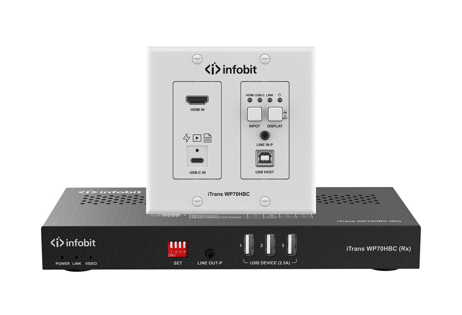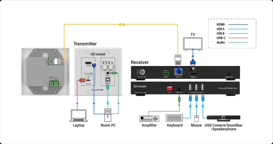 iTrans WP70HBC, 4K60 HDBaseT Wallplate Extender Kit med USB B/ USB C/ HDMI, 70m