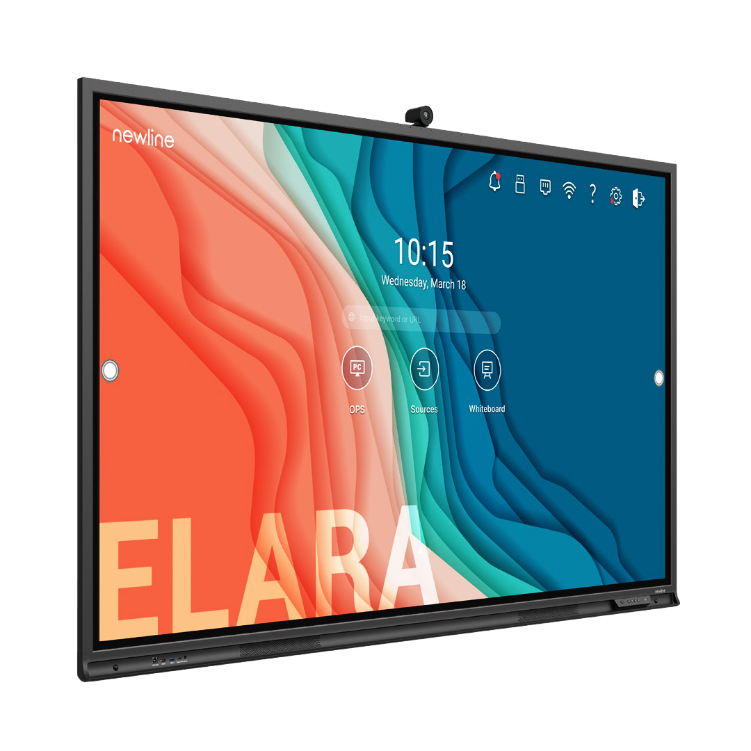 Högklassig interaktiv skärm som erbjuder allt du kan önska för ditt arbetsutrymme: snabbare och förbättrat ljud, en överlägsen beröring- och skrivupplevelse tack vare optisk bindning, en modulär kamera och inbyggd mikrofon som gör Elara till en äkta hybridlösning. Den extra breda betraktningsvinkeln säkerställer att alla i rummet kan njuta av den kristallklara 4K-bilden och de livliga färgerna.